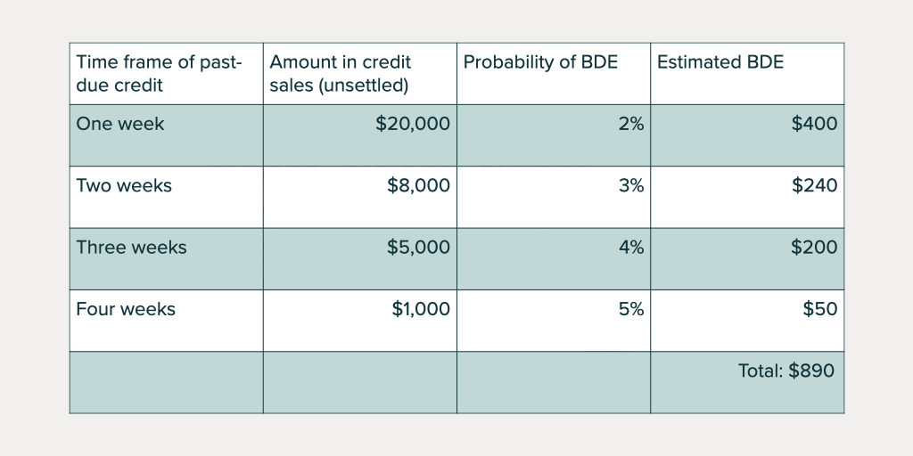 For this method, rather than taking the percentage of potential BDE from the entire period (let’s stick with a month, for ease), the percentage of receivables method breaks down the percentages into smaller time frames within a period and only focuses on the amounts unpaid from that period.