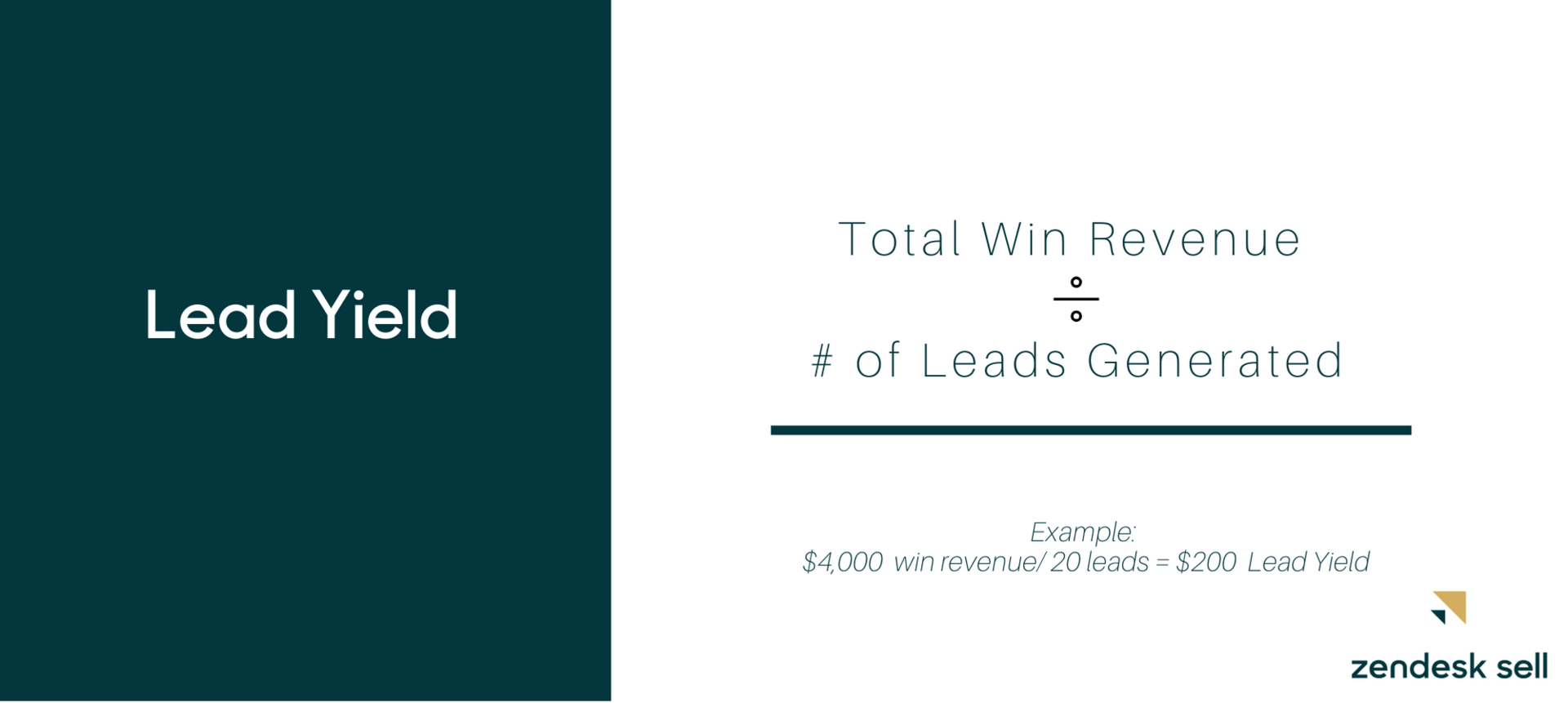 Lead yield is the total amount of revenue made from closed deals. It’s calculated by dividing total win revenue by the number of leads generated, as shown below: