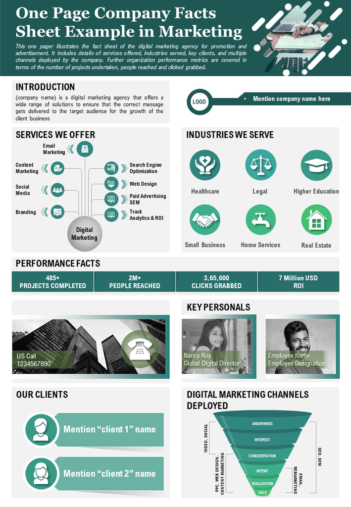 This is the One Page Company Facts Sheet template from Slide Team. Rather than focusing on one specific product, this sheet covers the company’s services, industries served, performance facts, current clients, and key personnel.