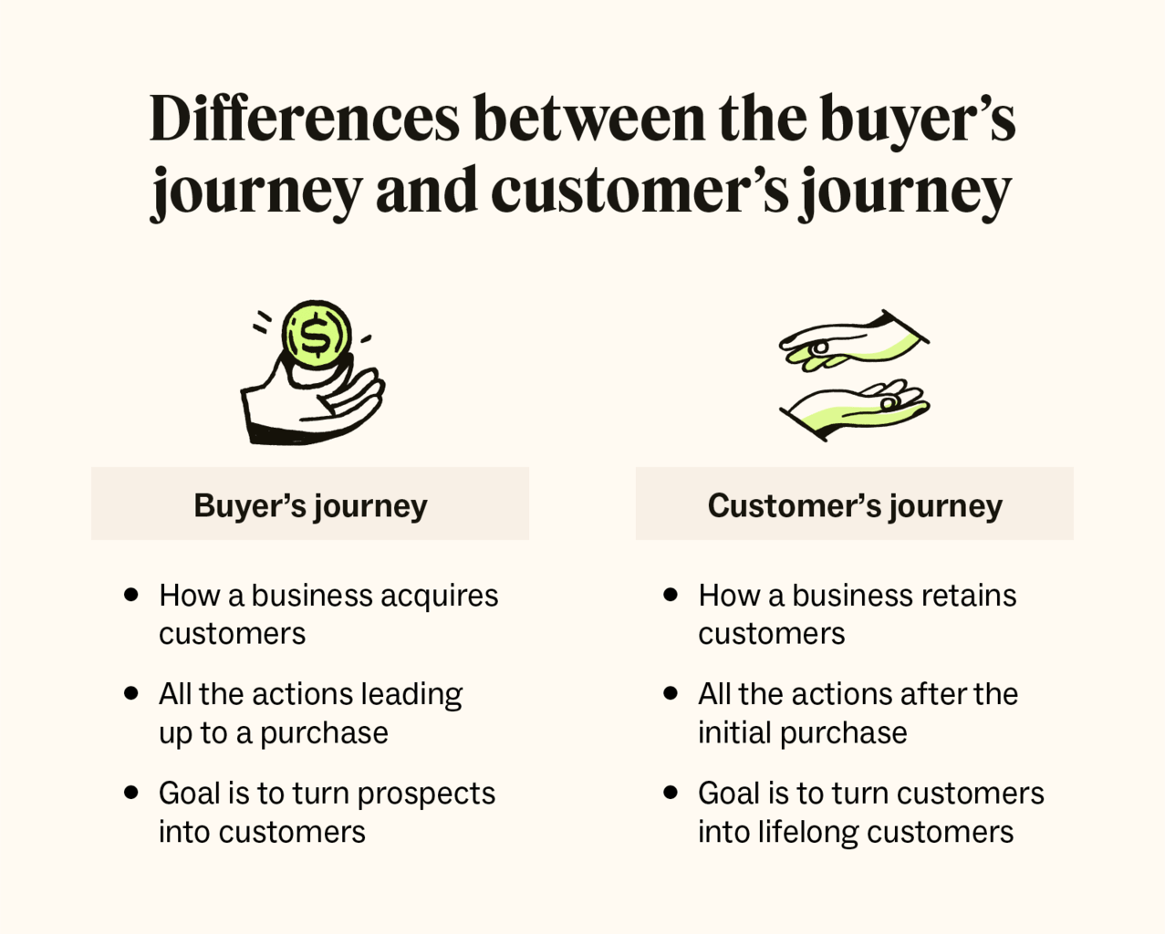 The buyer journey is how you acquire customers, while the customer journey is how you retain them.